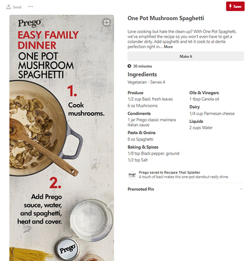 لاحظ كيف يجعل Prego دبوسهم يبرز في نتائج البحث مع صور جميلة ونص بسيط لكنه قابل للتنفيذ. عندما ينقر pinner على صورة مصغّرة، يتم نقلك إلى نسخة الصفحة الكاملة من الدبوس. لاحظ كيف يتبع Prego النص الجذاب وإرشادات خطوة بخطوة على دبوس الصفحة بالكامل.