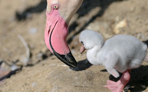 صور طازجة – طائر الفلامينجو وصغيرها في حديقة حيوانات في التشيك.