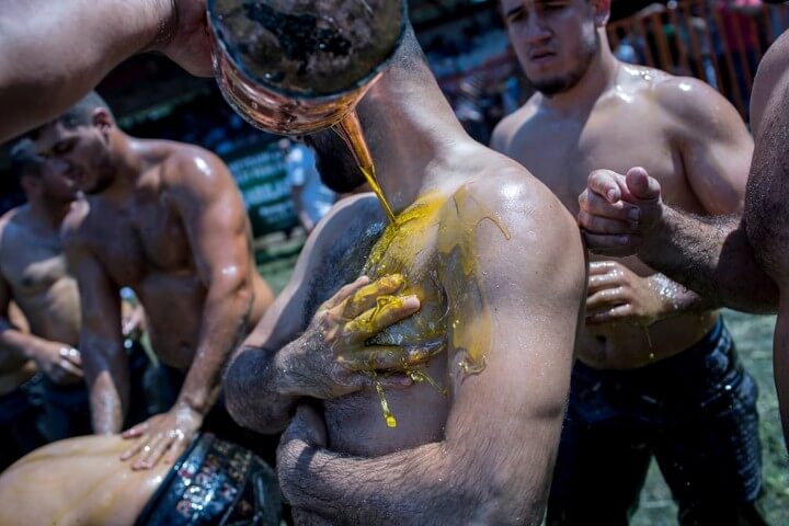 تركيا، مصارع يدهن جسمه بالزيت استعدادًا للمشاركة في مهرجان المصارعة الزيتية التقليدية في كيركبينار، أدرنة.