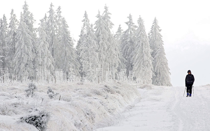 17 يناير 2016 – بلجيكا، رجل يتزلج على الثلوج في محمية طبيعية شرق بلجيكا.