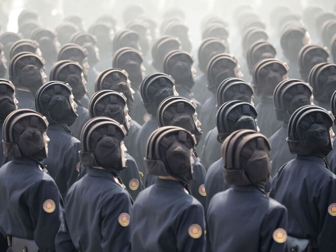 كوريا الشمالية، جنود خلال عرض عسكري بمناسبة الذكرى الـ105 لمولد مؤسس البلاد الراحل “كيم إيل سونغ” في بيونغ يانغ.