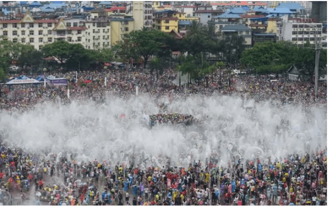 الصين، الناس يرشون المياه على بعضهم البعض خلال احتفالات مهرجان “رش الماء التقليدي” في مدينة جينغهونغ.
