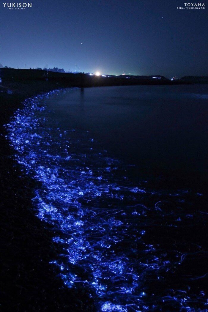 صور العالم – يراعات الحبار العجيبة؛ ظاهرة طبيعية سنوية تضيء خليج توياما باليابان ليلًا باللون الأزرق المتوهج.
