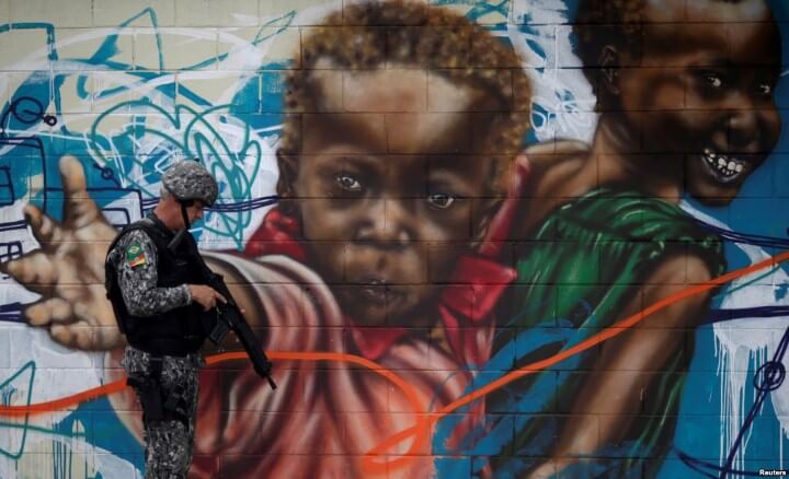 البرازيل، شرطي من الشرطة الوطنية لسلامة العامة البرازيلية يقوم بدوريات بالشارع بالقرب من مجمع الأحياء الفقيرة في تشاباداو خلال عملية أمنية تهدف للقضاء على الجريمة في ريو دي جانيرو.