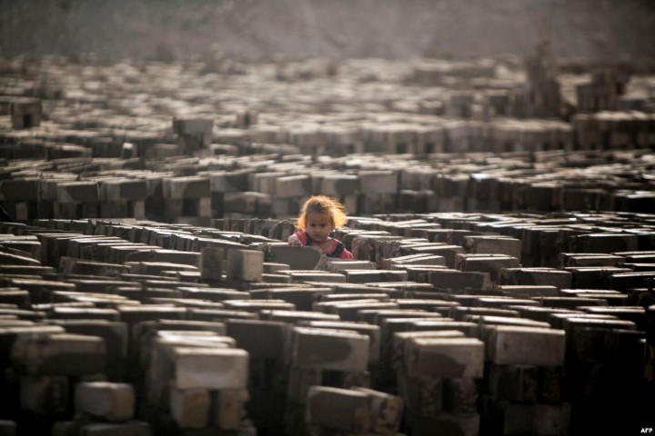 العراق، فتاة تقف في مصنع للطوب بالقرب من مدينة النجف وسط العراق.