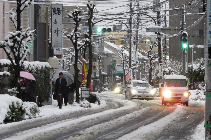 18 يناير 2016 – اليابان، مركبات وأشخاص يسيرون على طول شارع تكسوه الثلوج في طوكيو.