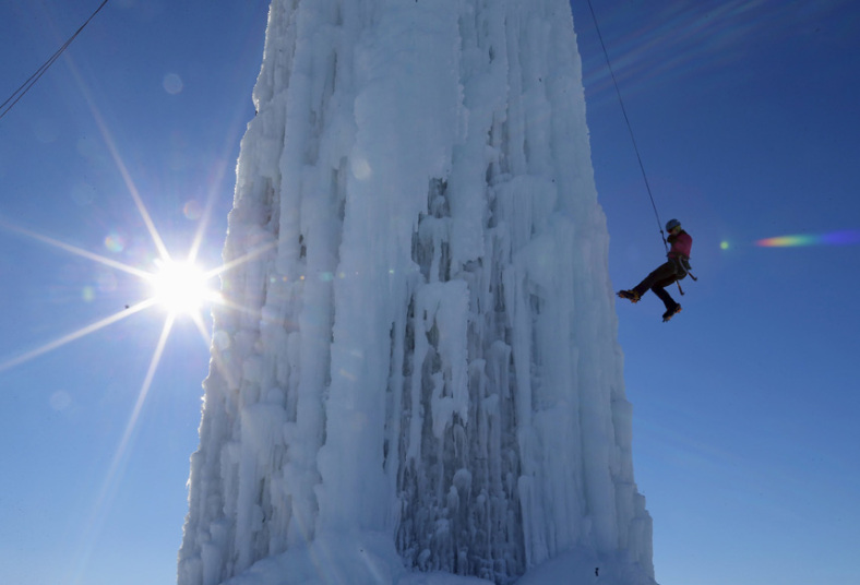 18 يناير 2016 – الولايات الأمريكية المتحدة، متسلق يتأرجح بينما ينزل على طول جبل ثلجي مستعينا بحبل في سيدار فولز، آيوا.