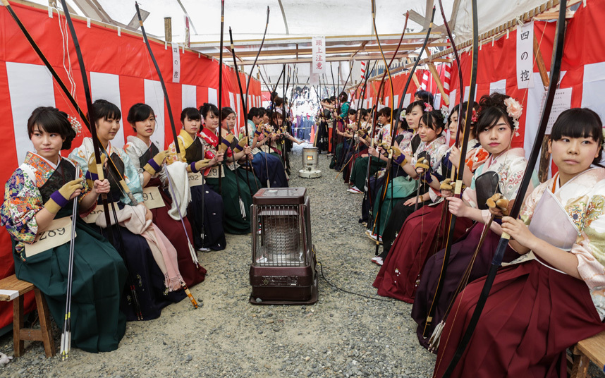 18 يناير 2016 – اليابان، مشاركات ينتظرن دورهن خلال حدث الرماية لسنة العشرين عاما في كيوتو.