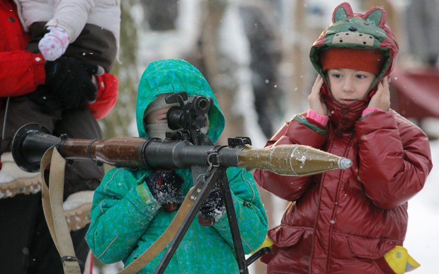18 يناير 2016 – روسيا، صبي ينظر عبر منظار قاذف صواريخ أثناء تفقده لمعرض عسكري في سان بطرسبرج.