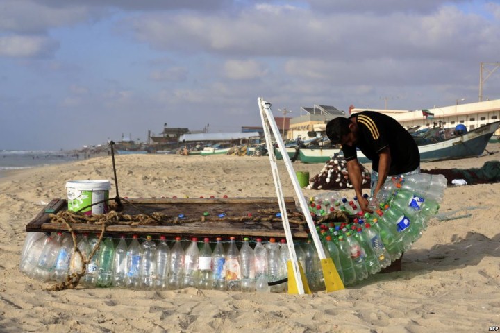 الأراضي الفلسطينية المحتلة، صياد فلسطيني يصنع زورقًا من 700 زجاجة بلاستيكية فارغة، على شاطئ مدينة رفح جنوب قطاع غزة.