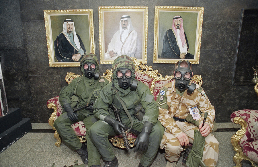 صورة ل 3 جنود من القوّات البريطانية أثناء مهام خاصة بالحماية والتأمين من الكيماوي في فندق بالسعودية بتاريخ 26 فبراير من عام 1991م.
