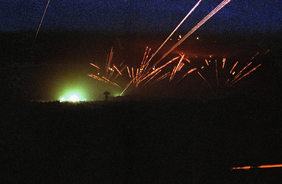 أضواء كاشفة ومضادة للطائرات في سماء بغداد، بتاريخ 17 يناير 1991م.