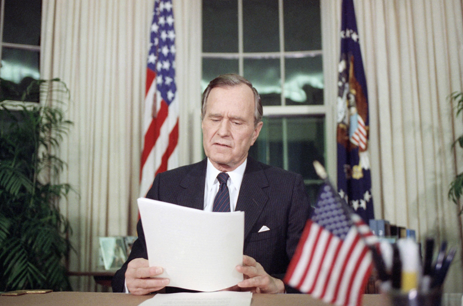 الرئيس الأمريكي جور بوش “الأب” في البيت الأبيض بتاريخ 16 يناير 1991م، وذلك عند إعلانه عن الحرب ضد العراق.