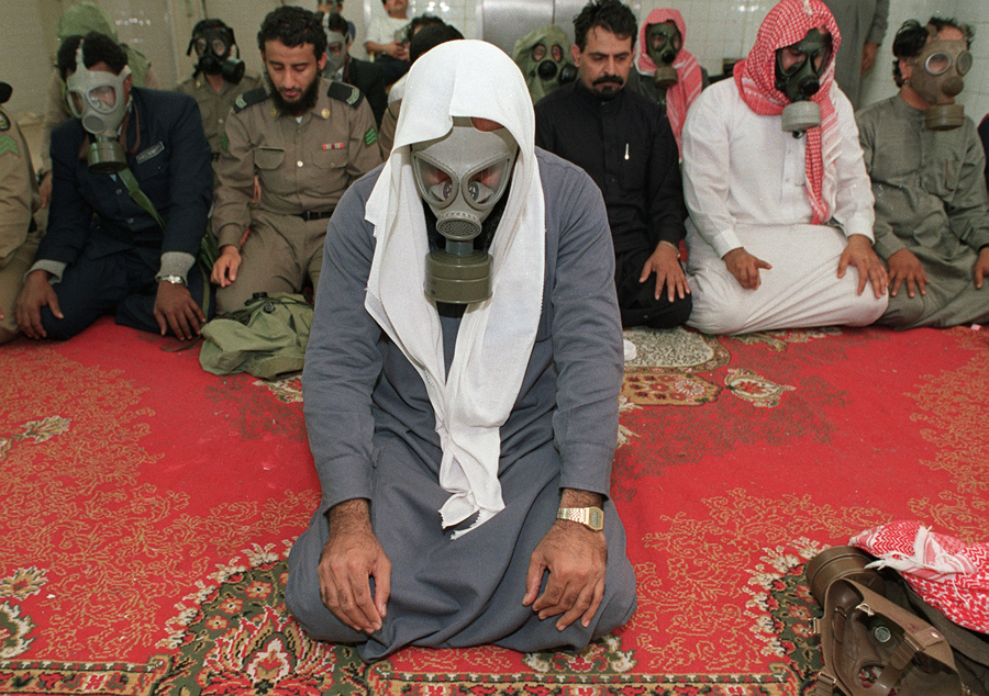 صورة من ملجأ سعودي في تاريخ 18 يناير 1991م، حيث يقوم مجموعة من السعوديين بتأدية الصلاة وبعضهم يرتدي قناع ضد الغازات الكيماويّة.