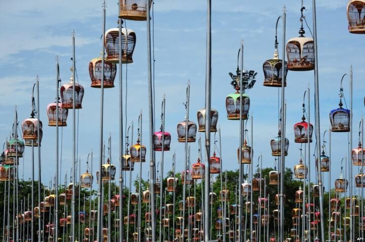 تايلاند، عشرات طيور الحمام في أقفاص معلَّقة على أعمدة خلال مسابقة لغناء الطيور في مقاطعة ناراثيوات، جنوب البلاد.