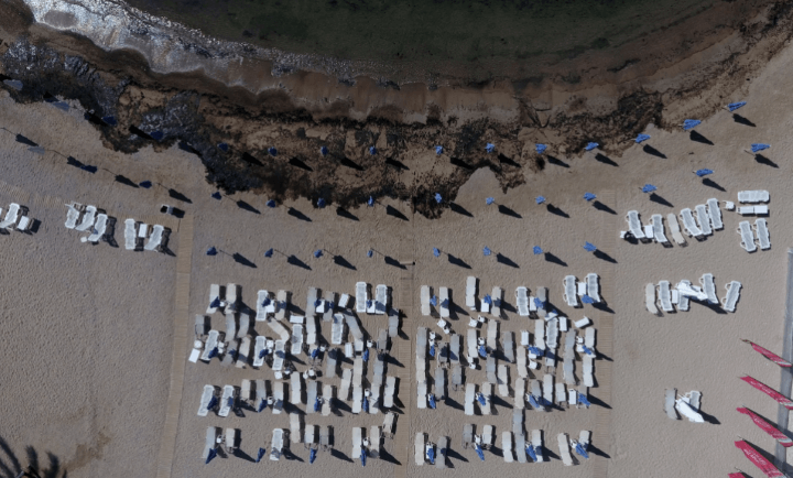 اليونان، نفط على شاطئ أجيوس كوسماس أمام كراسي الشاطئ بعد تسرب النفط من ناقلة غرقت في 10 سبتمبر الماضي في الريفيرا، أثينا.