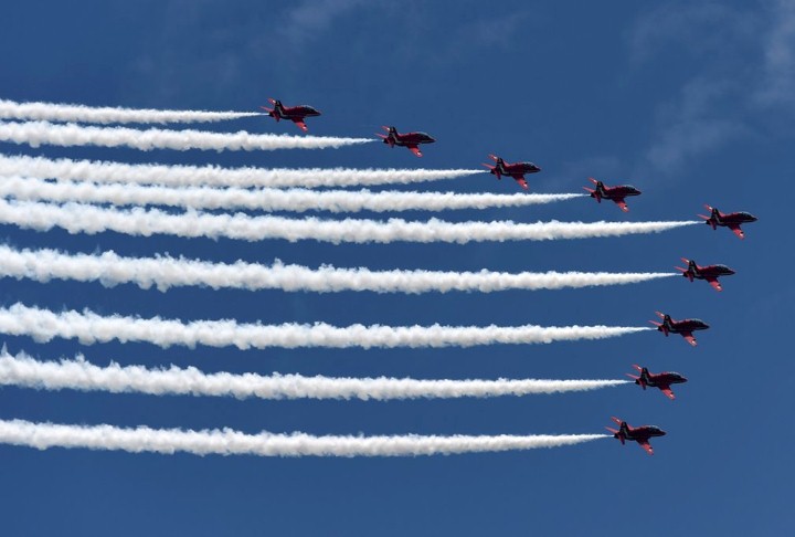 سنغافورة، فريق الاستعراضات الجوية “السهم الأحمر” يُنفذ عرضًا فوق المارينا.