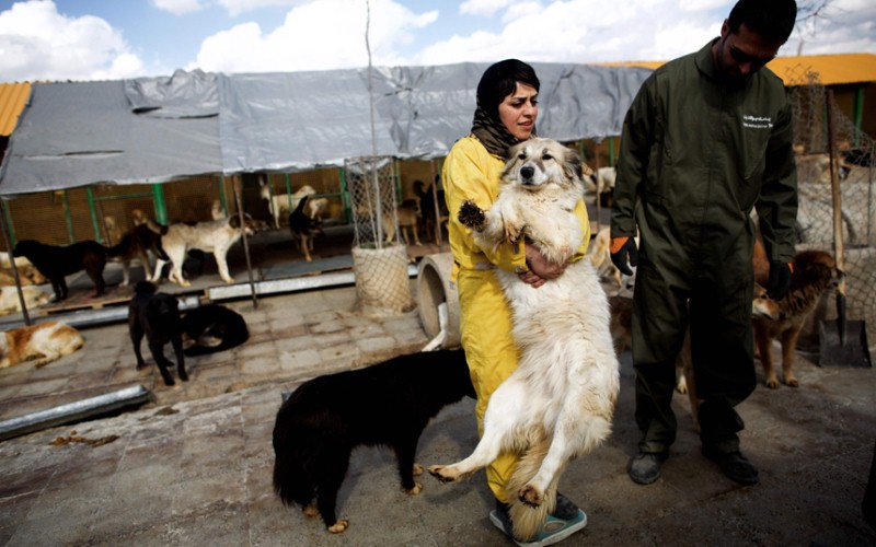 20 فبراير 2016 – إيران، متطوعون يزنون كلبا في مأوى للحيوانات الأليفة.