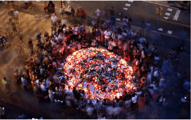 إسبانيا، الناس يتجمعون حول نصب تذكاري لضحايا حادثة الدهس التي قُتل خلالها 14 شخصًا في برشلونة.