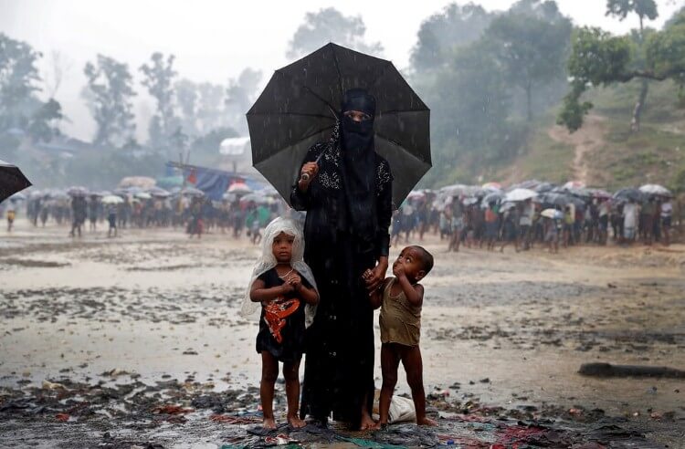 بنجلاديش، مسلمو الروهينجيا يقفون تحت المطر في مخيم للاجئين بمدينة بازار.