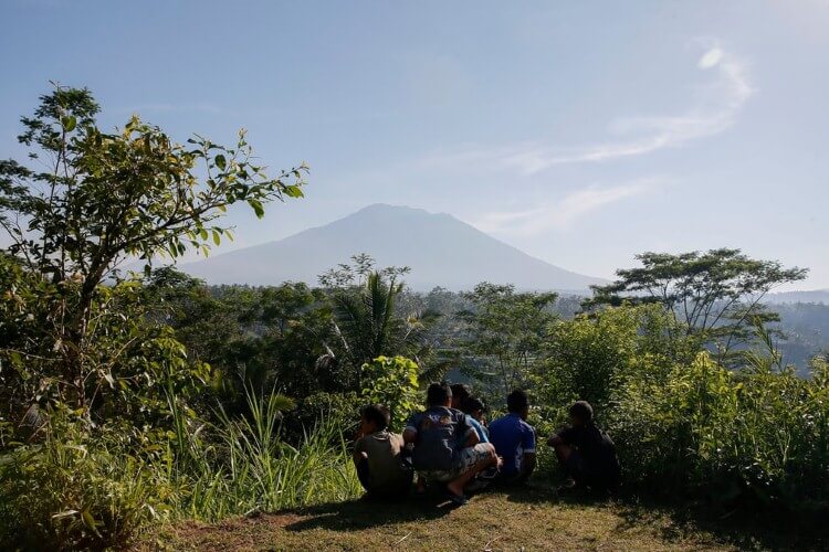 إندونيسيا، سكان محليون يتجمعون لمراقبة جبل “أغونغ” في “كارانغاسم” في بالي. وذلك بعد تحذير السكان من البقاء على بعد 7 كم عن الجبل بسبب ارتفاع النشاط الزلزالي في المنطقة.