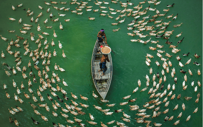 بنغلاديش، عشرات طيور البط تُحيط بقارب أحد المزارعين بانتظار تقديم الطعام لهم في نهر كاراتوا في الأجزاء الشمالية للبلاد.