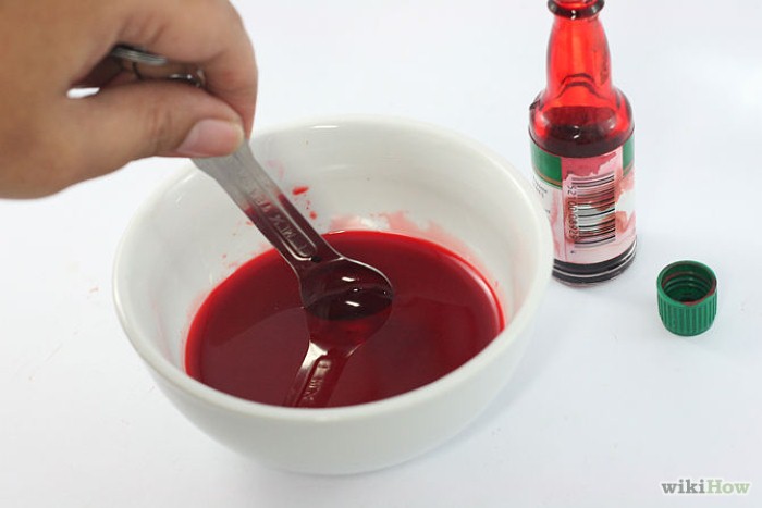 الطريقة: خلط مقدار محدد من شراب الذرة المخفف مع القليل من صبغة الطعام الحمراء ونقطة واحدة من صبغة الطعام الزرقاء لإعطاء الدماء لون قاتم.