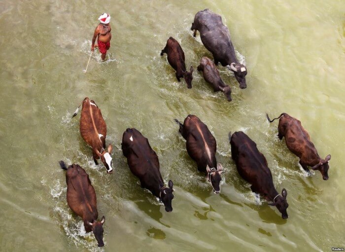 الهند، رجل يمشي بقطيع من البقر عبر نهر الجانغ في يوم صيفي حار في ألهباد.