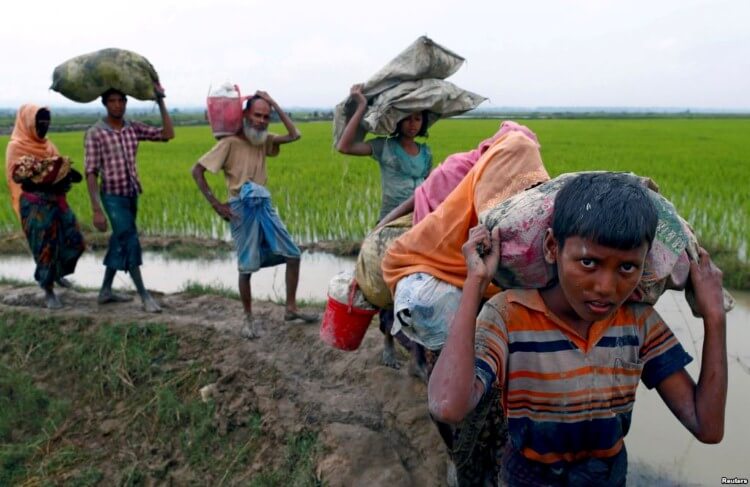بنجلاديش، لاجئو الروهينجيا المسلمون يسيرون على طريق موحل بعد عبور الحدود بين ميانمار وبنجلاديش، في مدينة تكناف.