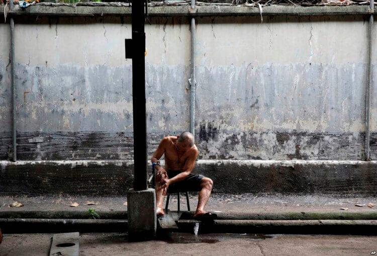 الفلبين، عامل يُنظف نفسه بالمياه قبل الرجوع إلى منزله في مانيلا الكُبرى.