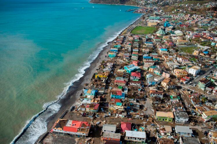جزيرة دومينيكا، منظر جوي لعاصمة جزيرة دومينيكا، روسو، وقد تدمَّرت المنازل فيها بفعل إعصار ماريا الذي مرَّ على الجزيرة قبل ثلاثة أيام.
