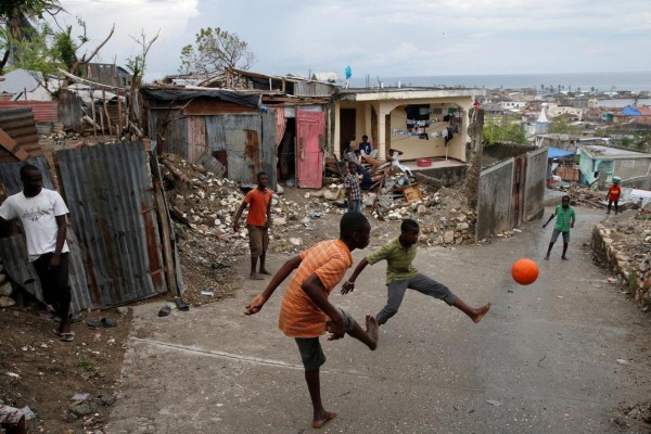 صور طازجة – فتيان يلعبان كرة القدم ويظهر حولهم الدمار الذي خلفه إعصار ماثيو في هايتي.