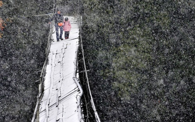 عبور جسر مكسور أثناء تساقط الثلوج للوصول إلى المدرسة في دوجيانغيان، مقاطعة سيشوان، الصين