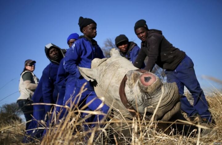 جنوب أفريقيا، عمال يُمسكون بوحيد قرن بعد نزع قرنه في محاولة لتقليل عمليات الصيد غير المشروع بحق الحيوان المهدد بالانقراض في العالم، في مزرعة خارج كليركسدورب.