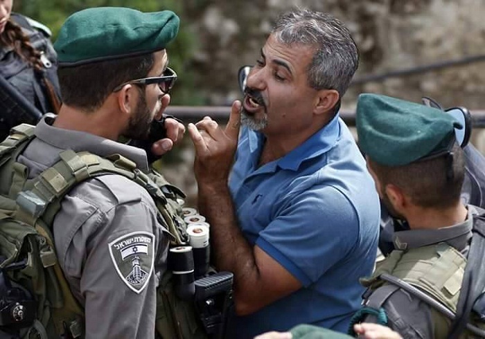24 أكتوبر 2015 – الأراضي الفلسطينية المحتلة، مسن فلسطيني يحاول منع قوات الاحتلال الصهيونية من الوصول إلى شباب الانتفاضة.