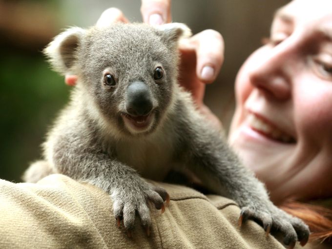 24 أكتوبر 2015 – ألمانيا، حيوان كوالا عمره 6 أشهر تحمله حارسة في حديقة حيوانات دويسبروغ.
