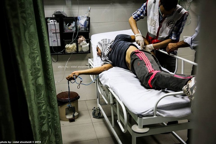 24 أكتوبر 2015 – الأراضي الفلسطينية المحتلة، أحد الشبان يتمسك بالمقلاع الخاص به وهو داخل المستشفى لتلقي العلاج بعد إصابته بالرصاص الحي خلال مواجهات على حاجز إيرز شمال قطاع غزة.