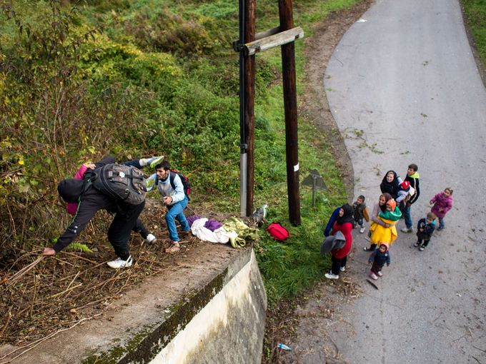 24 أكتوبر 2015 – النمسا، لاجئون ومهاجرون يساعدون بعضهم لعبور تل قرب خط السكك الحديدية بعد مغادرتهم مخيم لجوء على الحدود السلوفينية مع النمسا.