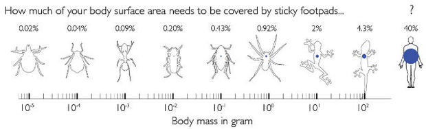 فالحشرات مثل النمل والعث لديها مساحة سطحية كبيرة نسبيا لكن حجمها صغير، فالحيوانات كلما كانت أثقل فإنها تحتاج إلى قوة التصاق أكبر لتلتصق بالجدار. فالسحالي على سبيل المثال هي أكثر الحيوانات التي يُمكنها الالتصاق على نحو سلس وتسلق الجدران بسهولة كبيرة، فهي تستعمل إجمالي مساحة سطح جسمها للالتصاق أكثر بـ 200 مرة من حشرة العث. ولو تم إدراج الإنسان ضمن هذه الدراسة، فمن الواضح أن جسم الإنسان يحتاج للعديد من المنصات اللزجة ليتمكن من تسلق الجدران كالسحالي نظرا لمساحة سطح الجسم الكبيرة.