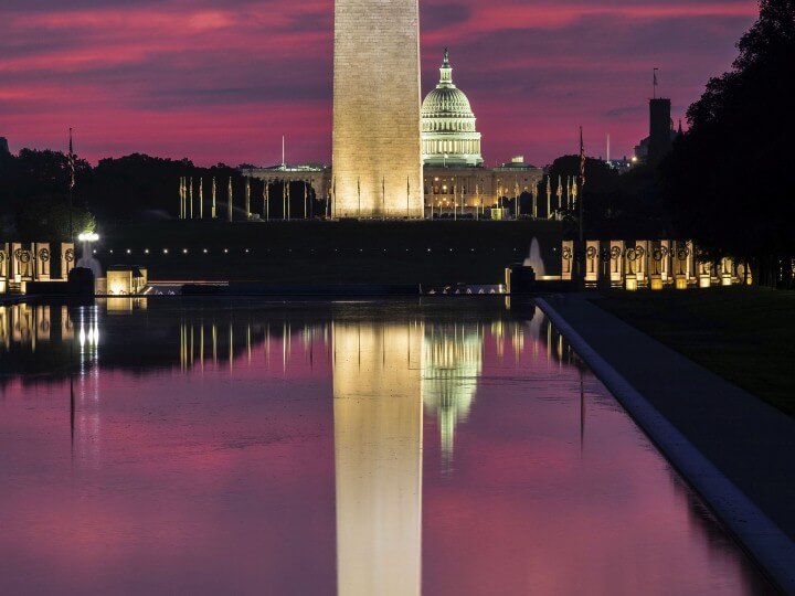الولايات المتحدة الأمريكية، انعكاس صورة مبنى الكابيتول الأمريكي ونصب واشنطن على بركة مياه في ناشونال مول عند شروق الشمس، في واشنطن.