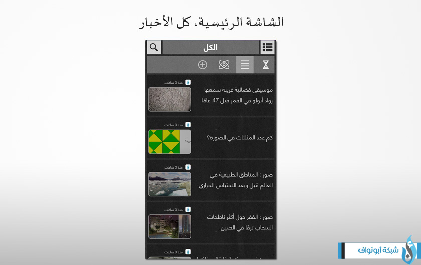 عند متابعتك لأحد المصادر، يمكنك فتح المصدر في التطبيق مثل شبكة أبو نواف، وسيتم عرض الأخبار كما هو موضّح في الصورة أعلاه.