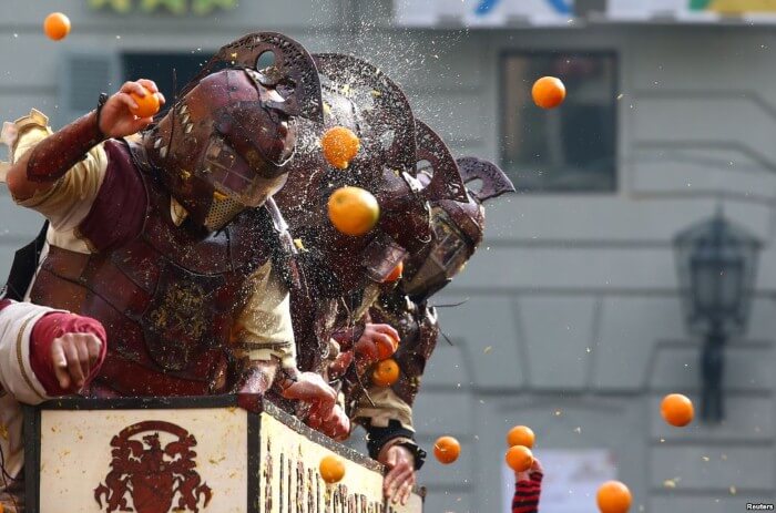 إيطاليا، أعضاء من فريق منافس يُلقون ثمار البرتقال على الفريق الخصم خلال كرنفال معركة البرتقال السنوية في الريفيرا الإيطالية.