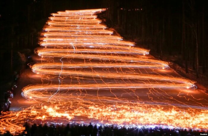 روسيا، المئات من المتزلجين والمتزلجات ينحدرون من منحدر تُضيئه المشاعل الكهربائية في المدينة السيبيرية “جيليزنوغورسك”.