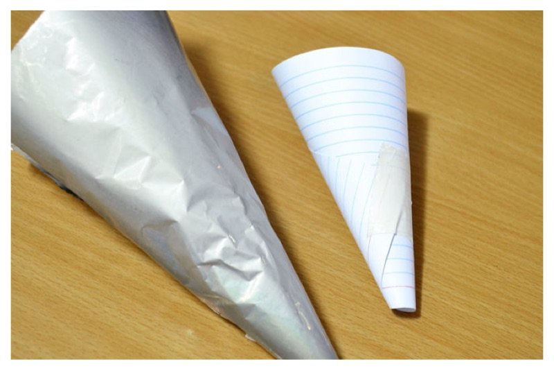 إن كنت بحاجة إلى قمع ولم يكن لديك واحدا، يمكنك أن تصنع واحدا عبر لف رقائق الألمونيوم على شكل مخروط واستعماله.