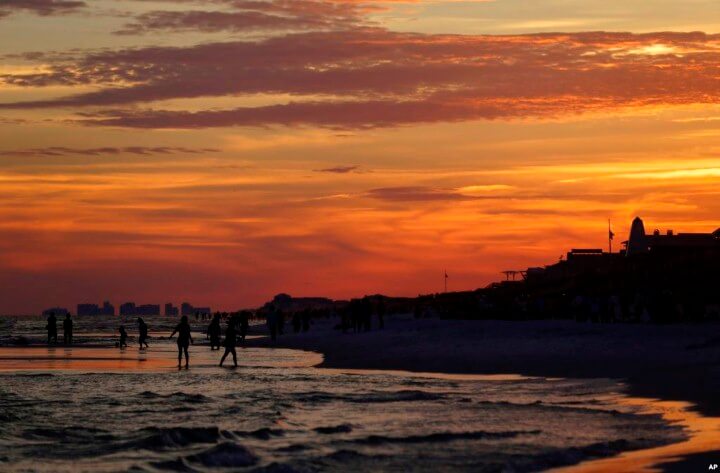 الولايات المتحدة الأمريكية، أشخاص يستمتعون بالأجواء الحارة على ساحل البحر أثناء غروب الشمس في فلوريدا.