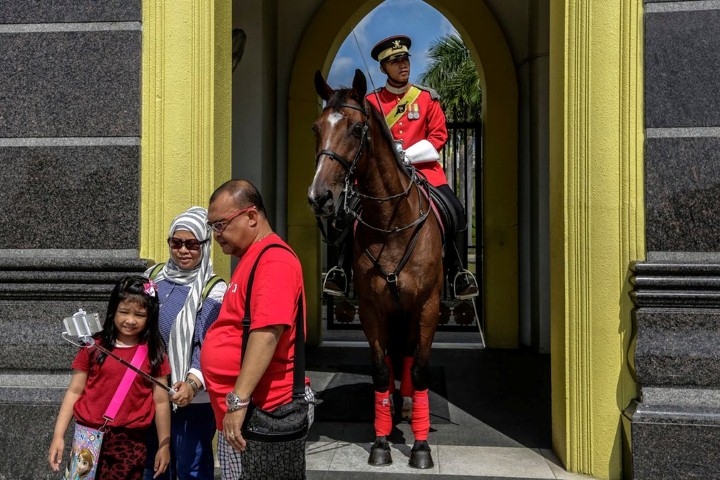 ماليزيا، سياح من إندونيسيا يلتقطون صورة مع أحد حراس الشرف الماليزي عند مدخل القصر الوطني في كوالالمبور.