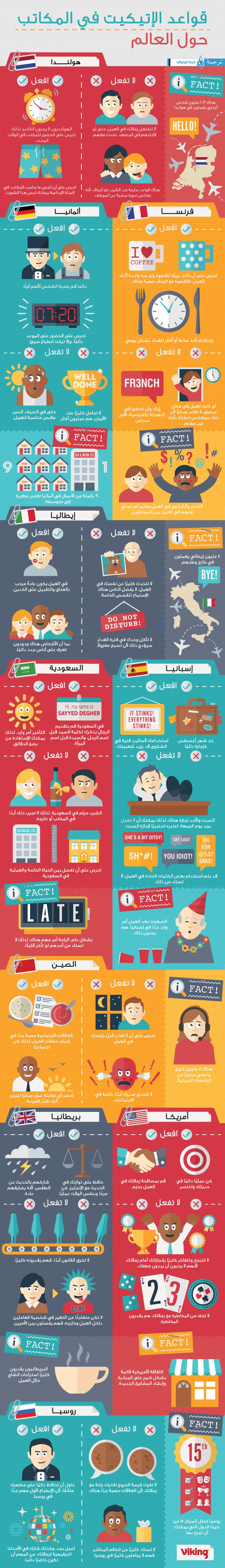 كل دولة لها قواعد إتيكيت خاصة بها من أجل أن تحافظ على صورة إيجابية لنفسك بين الناس هناك، وفي هذا المقال سنعرض صورة إنفوجرافيك تعرض أهم القواعد المتعلقة بالإتيكيت في المكتب في 10 من أهم دول العمل في العالم.