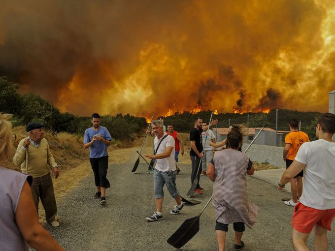 31 أغسطس 2015 – إسبانيا، سكان يتجمعون بالقرب من النيران التي اندلعت في غابات في غاليسيا لمحاولة منع وصولها للمناطق السكنية.